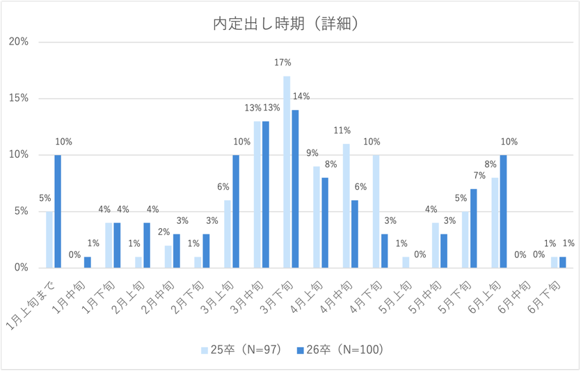 3月下旬にヤマが来ることは変わっていませんが、全体的に3月以前に内定時期がばらけている様子がうかがえます。